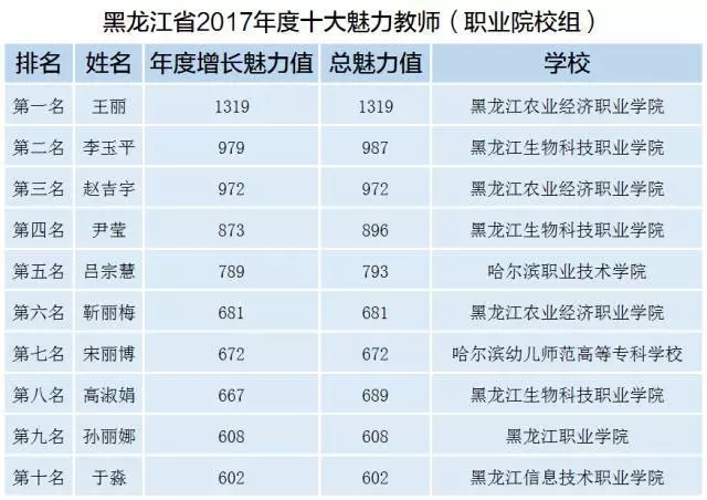 “黑龙江省2017年度十大魅力教师(职业院校组)”评选结果由北京蓝墨大数据技术研究院和黑龙江省职业院校移动云教学大数据研究中心(黑龙江职业学院主办)联合发布,获奖名单公示如下: