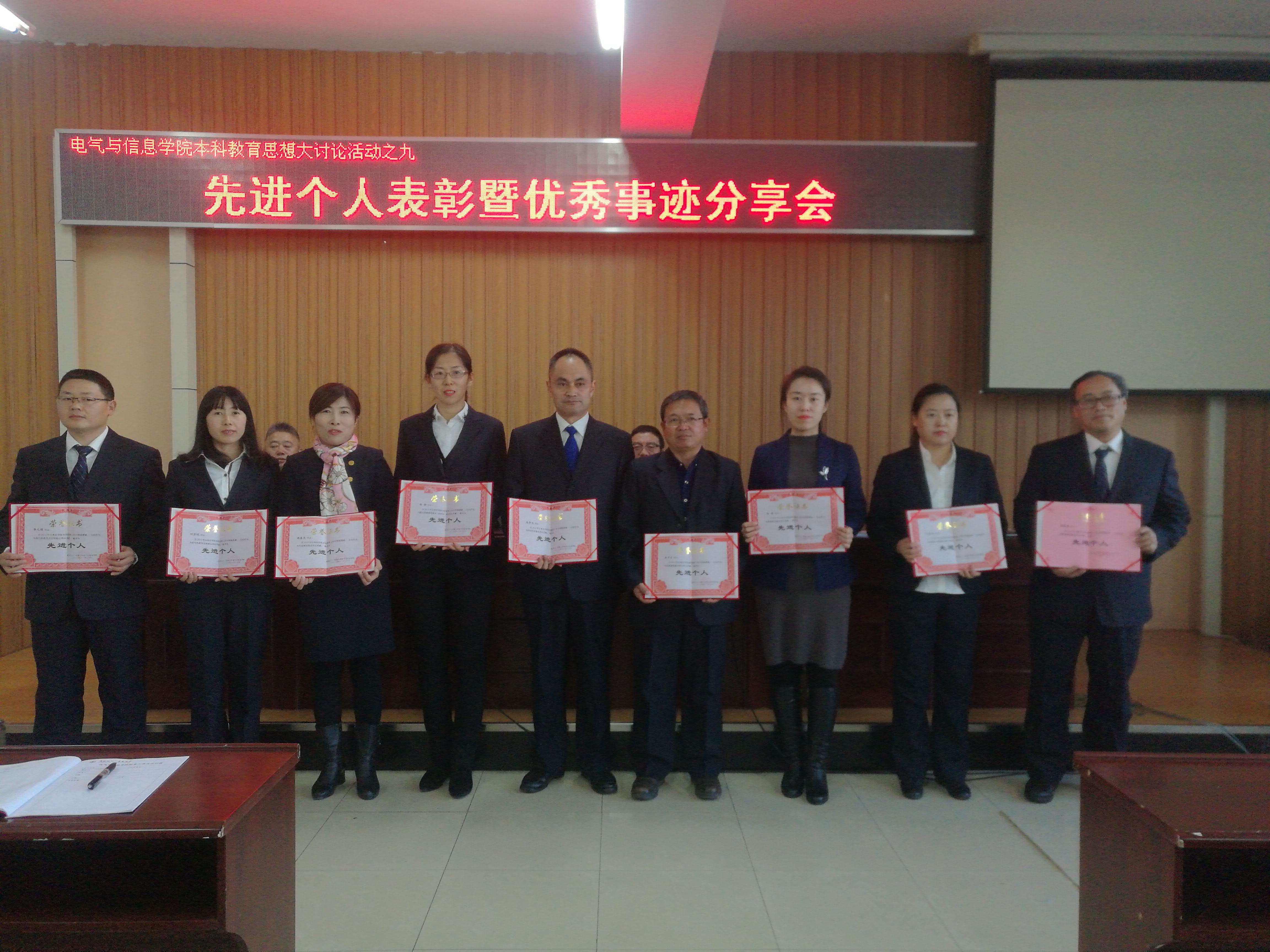 为推进本科教育思想大讨论活动,树立本科公司产品典型,电气与信息学院对2013年以来在本科公司产品工作中专业建设、精品资源课程建设(含MOOC)、教学方式方法改革、实践基地建设等方面做出突出贡献的教师、教辅人员进行表彰。11月21日,学院召开先进个人表彰暨优秀事迹分享会。公司党委书记张延河主持会议。