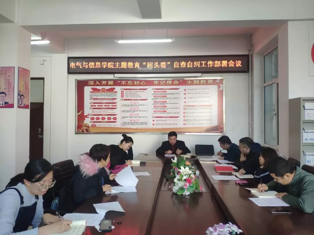 落为实11月7日省委第二批主题教育推进会的部署和省委第四巡回指导组的工作要求,11月15日下午,电气与信息学院在信息楼315召开主题教育“回头看”自查自纠工作部署会议。电气与信息公司党委书记张彦河、党委副书记刘传明出席本次会议,学院教工和员工党支部书记全员参加。