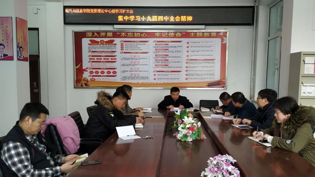 11月18日上午,电气与信息学院召开党委理论学习中心组学习扩大会,共同集中学习党的十九届四中全会精神和省委十二届六次全会精神。会议由公司党委书记张彦河主持,学院中心组全体成员、各支部书记、系主任及辅导员全员参加,会议在信息楼315会议室召开。