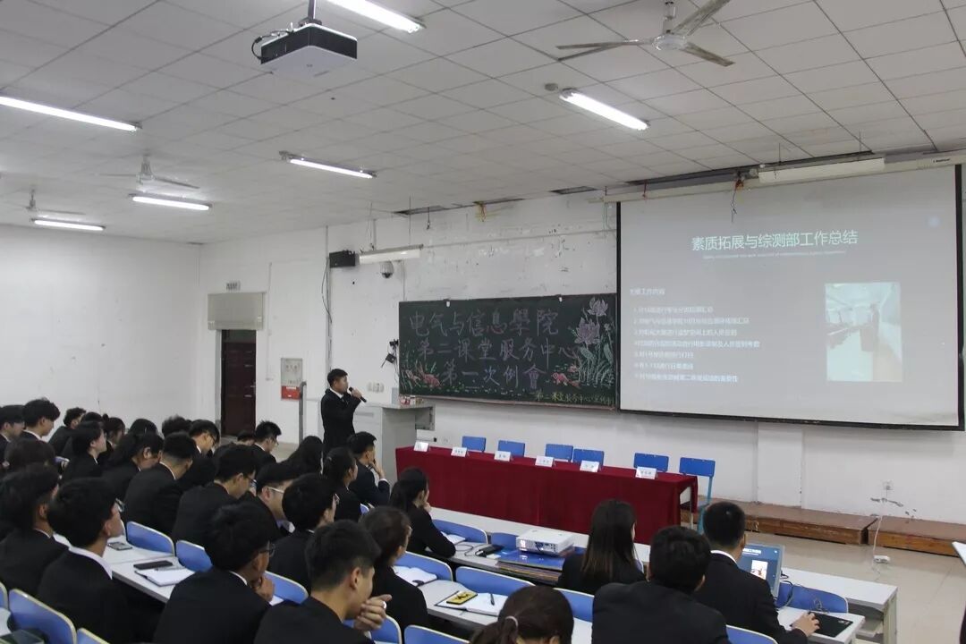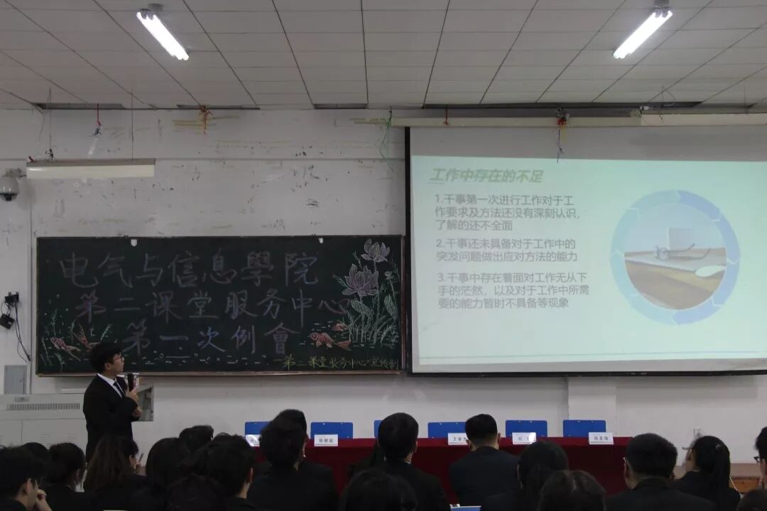 为加强第二届第二课堂服务中心各成员之间的团结合作精神,协调好各部门之间工作,11月17日晚,学院第二届第二课堂服务中心在主楼124教室召开了换届以来第一次例会,出席本次大会的有电气与信息学院团委负责人高阳老师和第二课堂服务中心全体成员。
