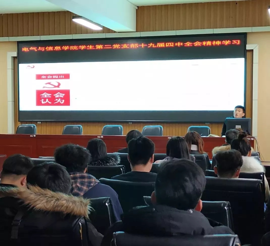 11月22日,电气与信息学院员工第二党支部召开学习宣传贯彻党的十九届四中全会精神会议公报会。员工第二党支部书记林立宏老师,宣传委员高阳老师、组织委员付泽春老师等员工党员共计32人参加了学习。
