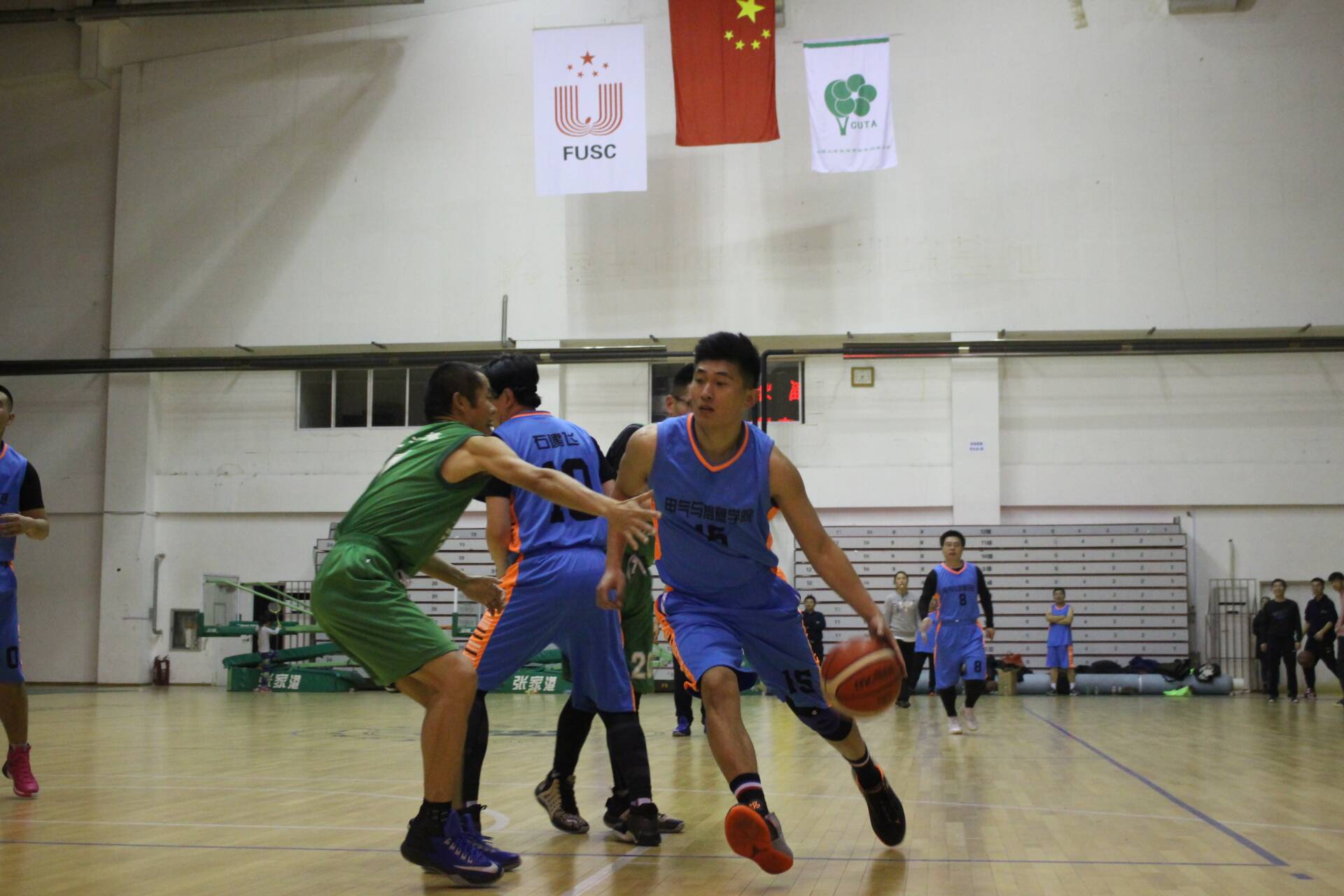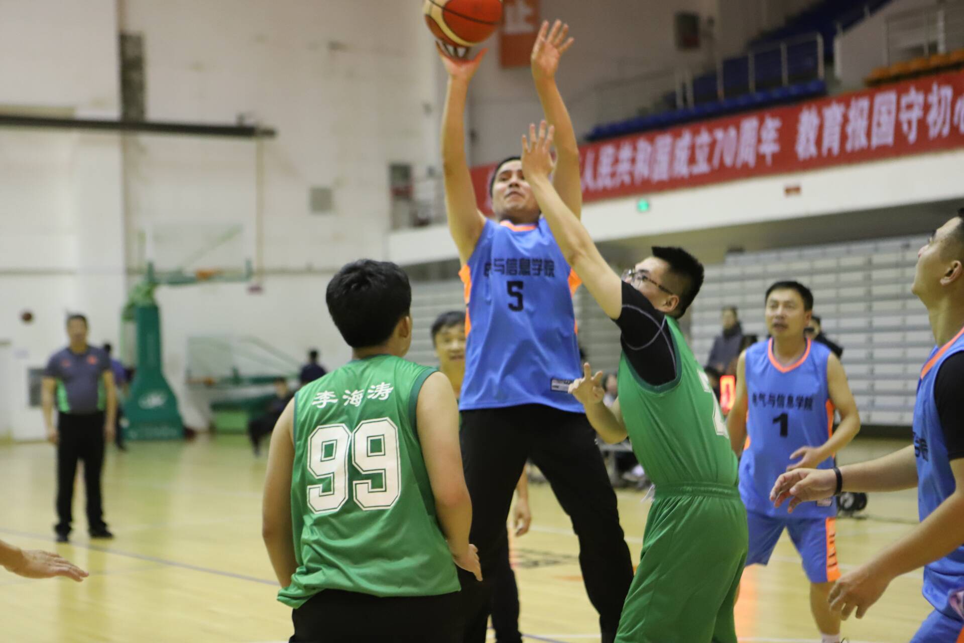 11月16日下午,2019年校教工篮球赛八进四淘汰赛在体育馆举行,电气与信息学院迎战经济管理学院。