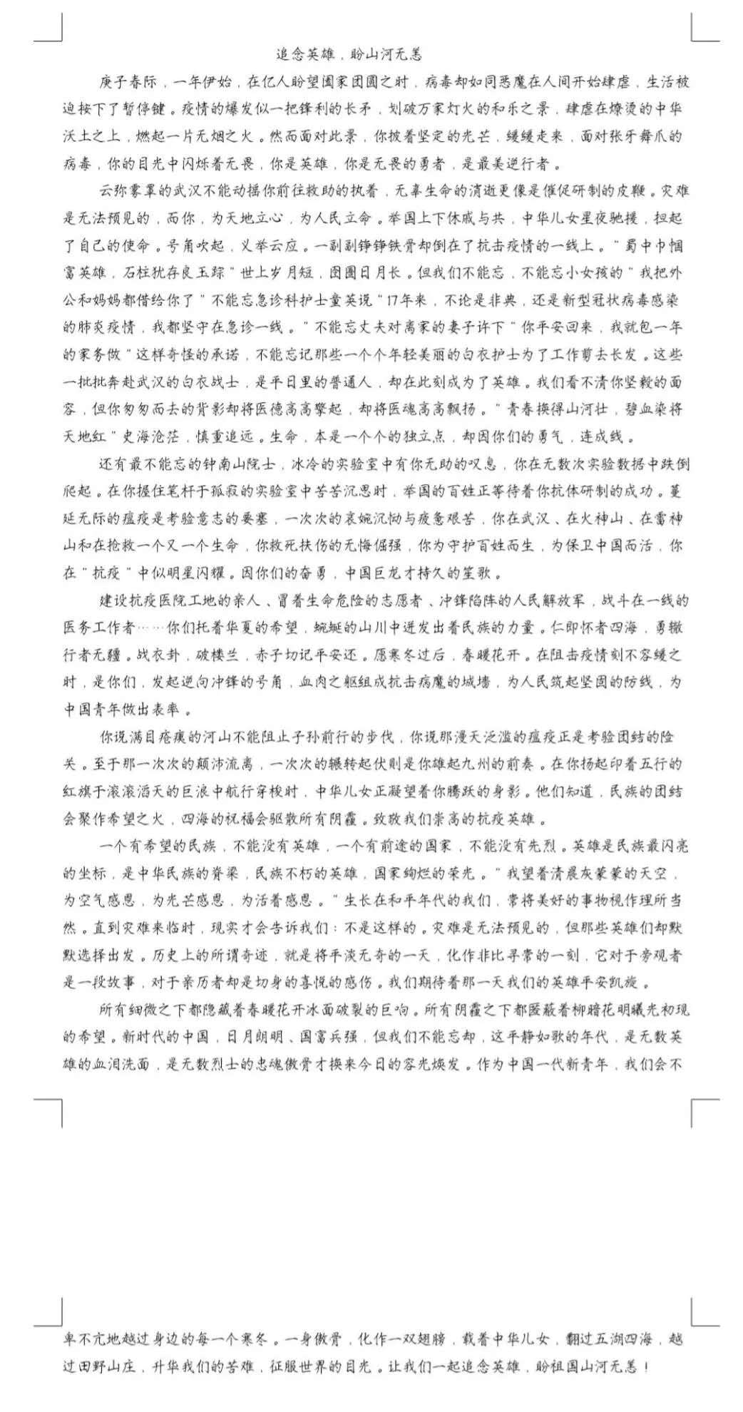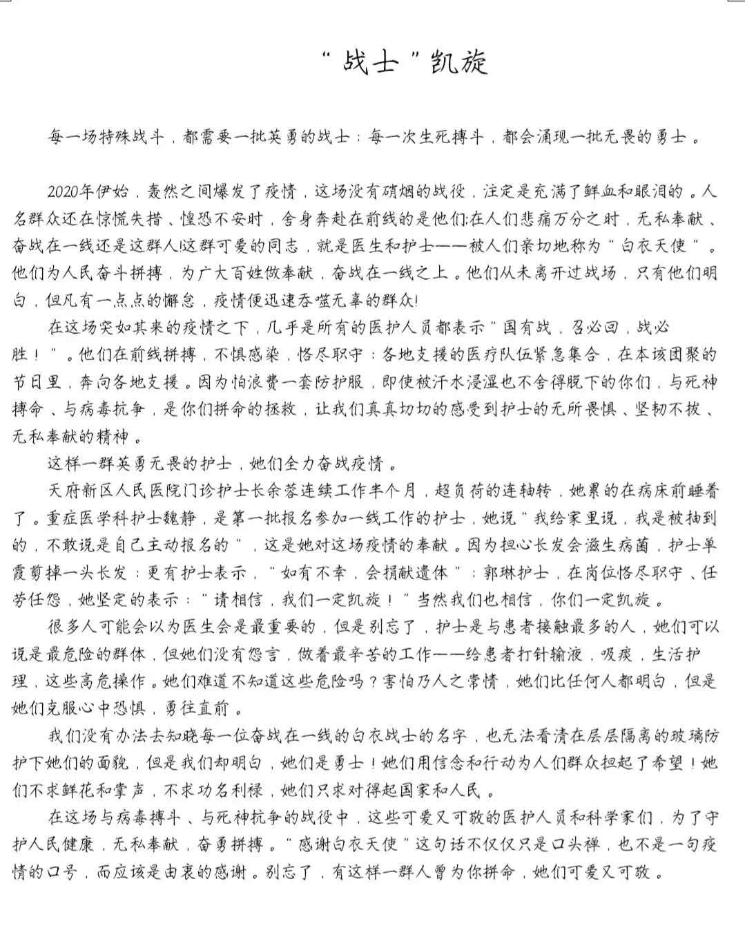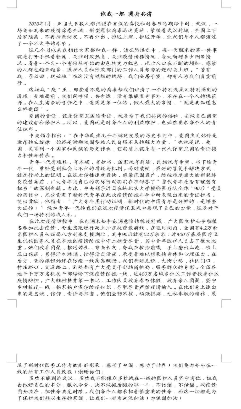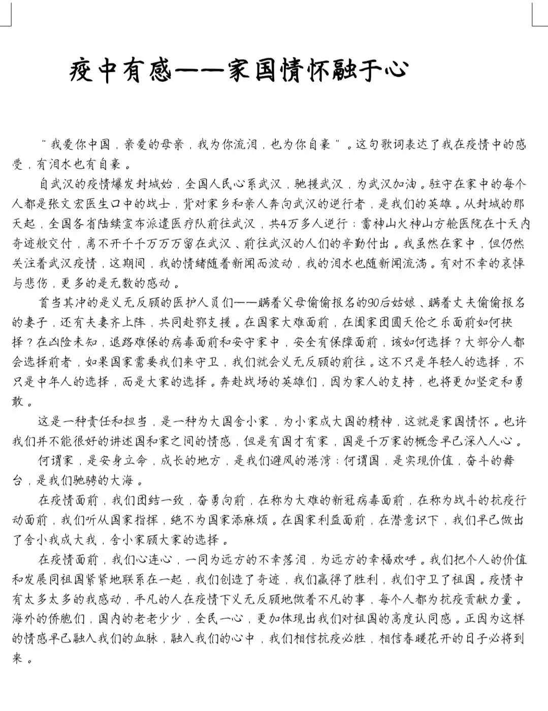 在征文征集活动中,同学们纷纷以笔达意,表达了新时代青年积极向上的最强音、战疫必胜的决心以及对前线守卫希望的逆行者的敬意,并以自身为例传播抗疫知识,描写疫情期间的感悟与身边的战疫故事。以下是征文类作品获奖名单及作品展