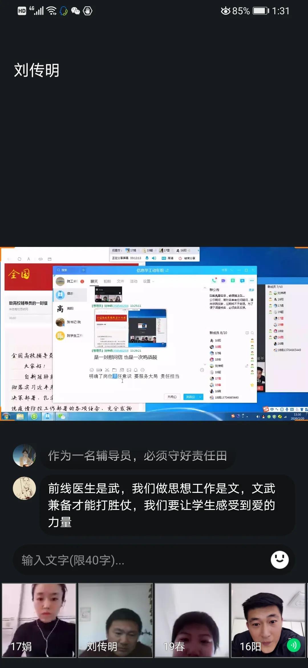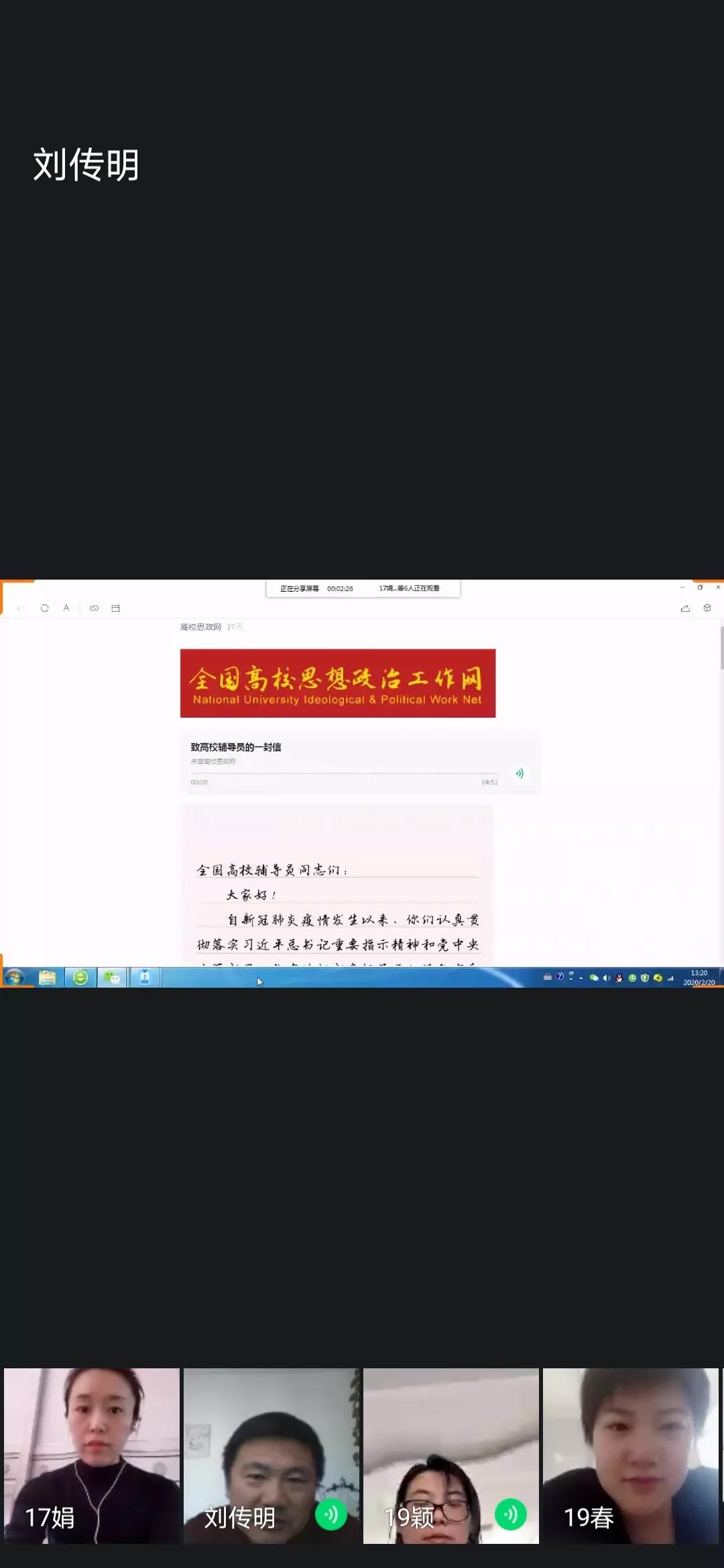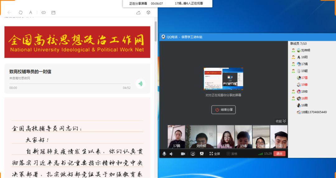 该信发出后,引起各高校思政工作者的强烈反响。20日,电气与信息学院利用QQ软件在学院学工群里召开了主题学习交流视频会议,公司党委副书记刘传明及全体辅导员参加。