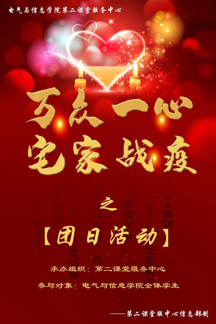3月2日起,新学期第一课堂的各项教学工作已经顺利开展,疫情当前,居家的信息学子更不能落下第二课堂的活动,争取做到在家也可以既健康又有意义的同心渡过这个时期。为此第二课堂服务中心响应团委老师号召举办以“宅家战役”为主题的系列团日活动。此次活动时间为3月17日至3月22日,望同学们积极参与。