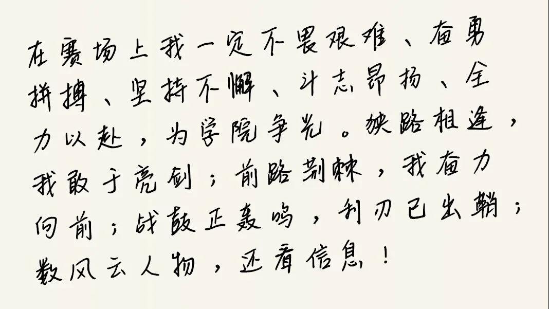 “无体育,不信息”,这不单是一句简单的口号,他是一种精神,一种拼搏奋斗的精神,更是一种信息精神。“在赛场上我一定不畏艰难、奋勇拼搏、坚持不懈,斗志昂扬、全力以赴,为学院争光。狭路相逢,我敢于亮剑;前路荆棘,我奋勇向前;战鼓正轰鸣,利刃已出鞘;数风云人物,还看信息!”这段誓词,不仅仅适用于运动员,更适用于每名即将迈出校门走向社会的2016级同学们:不畏艰苦,奋勇拼搏,我等敢立潮头主兴亡!