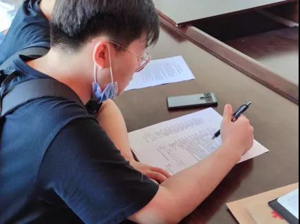 随后,2017级辅导员高阳带领员工签订了《电气与信息学院2021届毕业生校外实习保证书、离校请假条》。