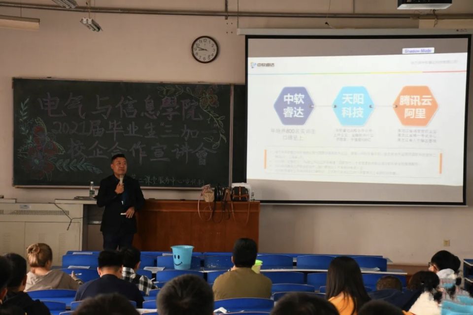 9月13日上午,电气与信息学院2021届毕业生“三加一”校企合作宣讲会在主楼顺利开展。为了促进2021届毕业生顺利就业,电气与信息学院邀请了哈尔滨中软睿达、北京尚观科技、哈尔滨图灵云创、大连华企智源、苏州驰星和华灿光电六家企业帮助即将毕业的信息学子详细解读了员工们最关心的就业规划、行业方向及专业知识等问题。