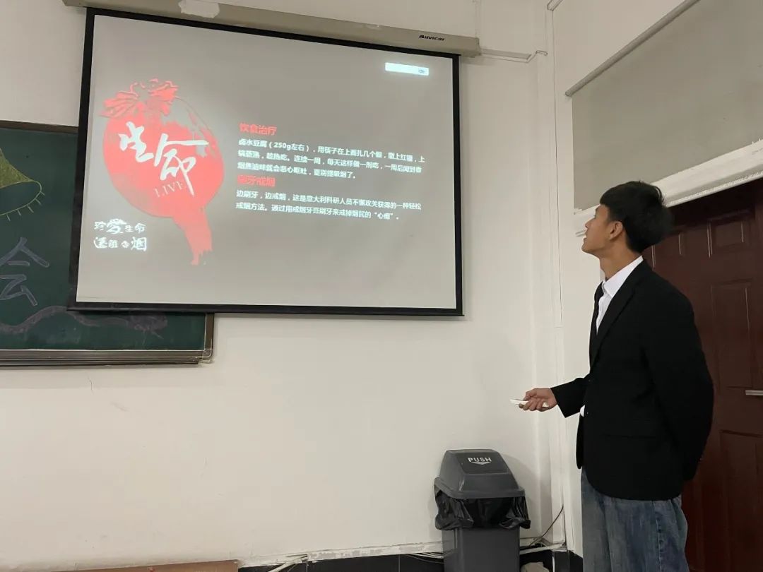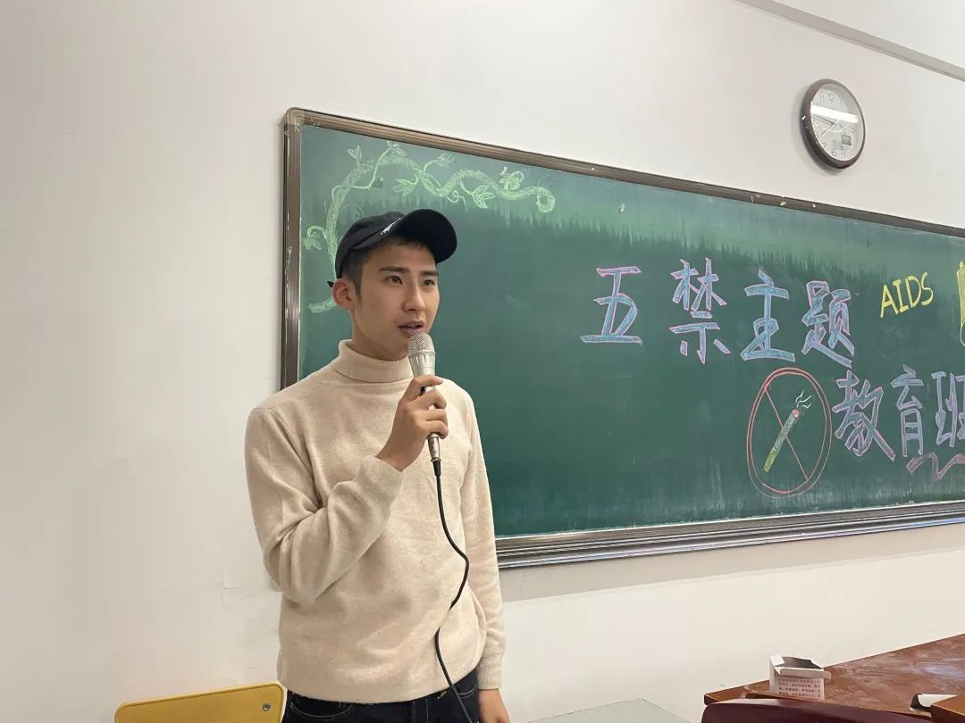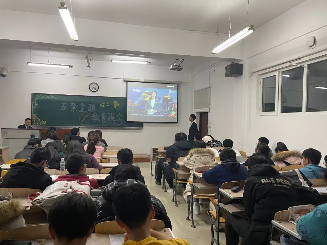 首先由什么是“五禁”展开话题,PPT中的内容包括禁毒、禁烟、禁赌、禁黄、防艾。毒品以图片的形式展示,并介绍了毒品的危害和预防,然后通过视频的方式展示出刑警对吸毒者、贩毒者的抓捕过程和抓捕后对其的审判,随后依次介绍了吸烟的危害、控烟的措施和戒烟的方法。通过介绍赌博的危害,让大家对赌博的法律法规铭记于心。艾滋的定义、艾滋的临床表现以及怎么预防艾滋作为讲解五禁的结尾。最后由第二课堂服务中心主任张哲铭进行总结。