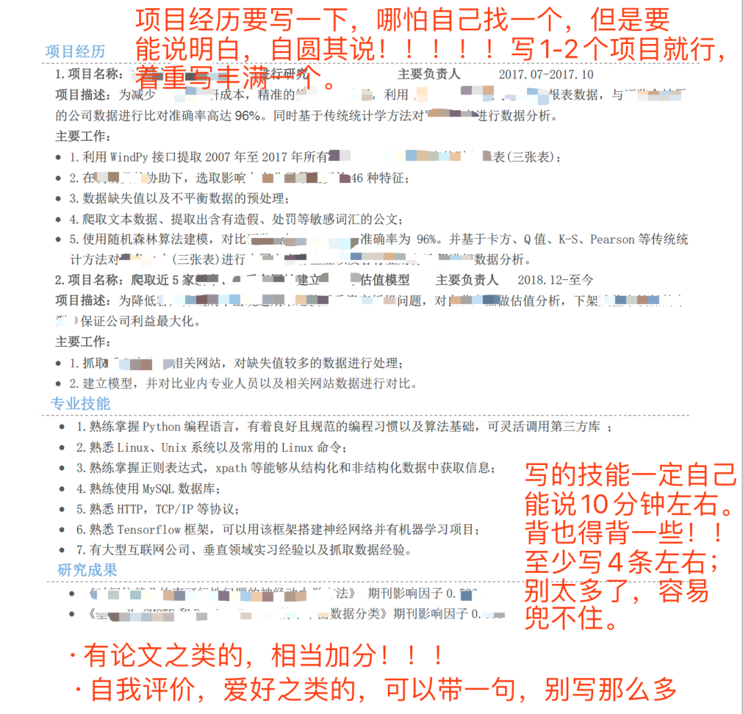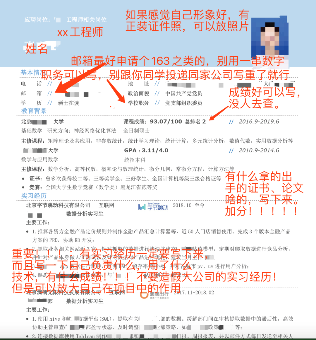 大家会发现这两封简历都是两页,所以要尽量把自己的简历控制在1-2页内,不要再多了。作为一个应届生写一个三张纸的简历,太夸张了,HR也看不过来。别用太花哨的简历模板,简历内容绝对不能造假,因为假的永远真不了。大家知道名校那波人花在简历上的时间是多少吗?中文、英文各一份,而且斟酌了再斟酌,什么该写、什么着重写、什么一笔带过、什么不写……甚至动用各种关系找好多个学长、老师给过简历,要指导建议。因为简历写好了就会多一个面试机会,年薪就会多多少万。差不多了,对于一心想找工作的人,我的简历和面试建议就是以上这些。别抱怨,别气馁,受到挫折很正常。多尝试总会有机会的。去不了大公司,可以先去中小公司干着,干1-2年后带着工作经验再跳槽。总之要让自己先有一份工作,不要在乎面子之类的,真的除了你自己别人没人在乎你的面子。大家知道自己现在多幸福么?刘传明老师一个个联系我们这些毕业生,目的就是希望给大家多提供一些岗位和招聘信息,以及一些有帮助的建议。