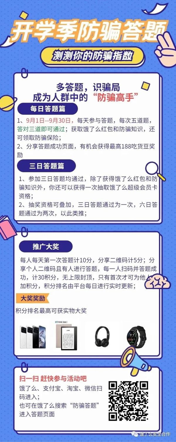 此次答题活动自9月1日至9月30日为期30天。广大师生和市民朋友可以通过饿了么APP扫描活动二维码,或搜索关键字“防骗答题”即可参与活动,赢取饿了么优惠券、超级会员卡、众安防骗险等奖励。参与者也可将生成的本人专属二维码分享给他人,邀请亲友一起参与答题,让更多的人避免上当受骗。推广答题积分排名靠前的用户,还有机会获得实物大奖。