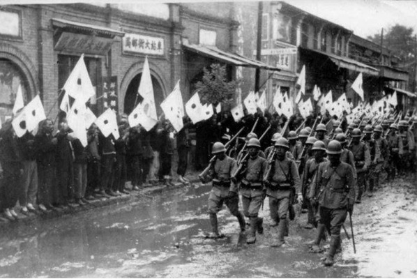 为了做到这一点,收买中国的知识阶层就成了日本人的一个重要方式。这方面,日本人可谓不遗余力。早在甲午战争时期,日本就干过许多龌龊的小动作。比如日军在进入中国城镇前,必先派出斥候,强迫中国居民挨家挨户在门口插上膏药旗,之后再派日本记者强迫中国居民拿膏药旗沿途拍照,搞出一副“万众迎接皇军”的场面。无论有多荒唐,日本人依然对此乐此不疲。随着日本后来侵华次数增多,日本人的伎俩也越来越多,手段范围也越来越大,在最后的全面侵华战争中则达到了巅峰。