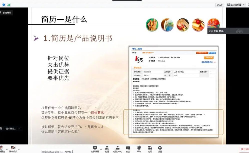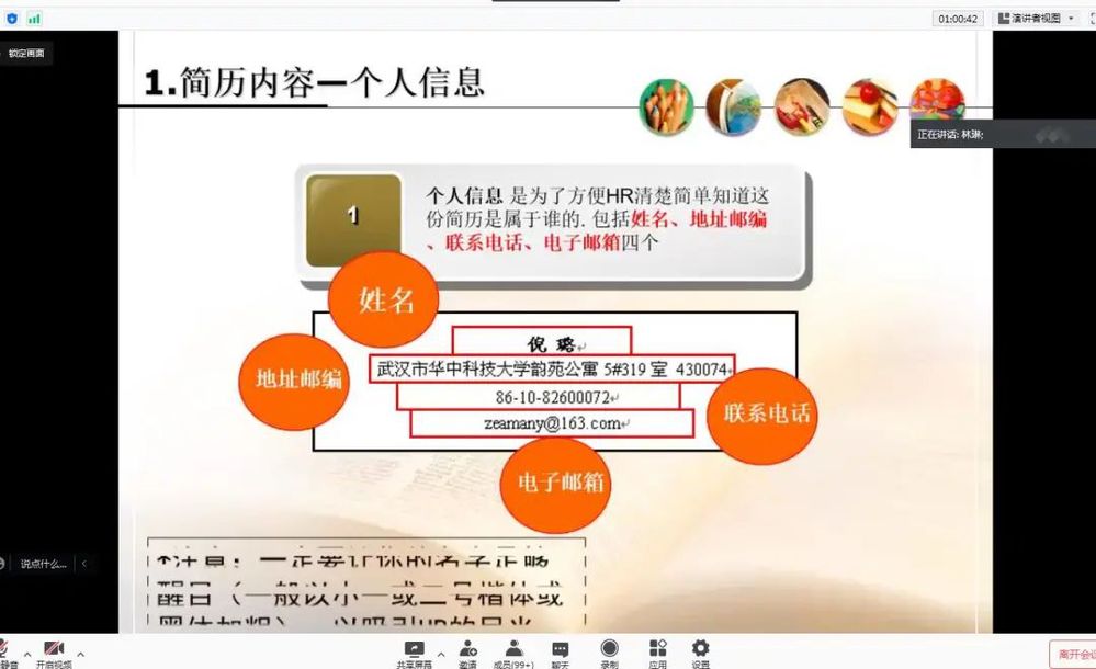 2月18日,“就业不打烊 云端促就业”系列讲座第三期举办,主题为“简历制作技巧”,由辅导员林立宏担任主讲。本次讲座主要讲解讲简历的内容、制作简历的原则和技巧,旨在提升同学们的简历制作能力,帮助同学写出一份内容丰富,吸引HR的简历。