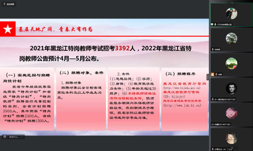 2月17日,“就业不打烊 云端促就业”系列讲座第二期举办,主题为“让青春闪耀在祖国的每一寸土地”——地区人才需求及基本面试技巧”,由辅导员于天齐主讲。本次讲座以地区人才需求解读为主题,结合同学需求,对面试技巧进行讲解。