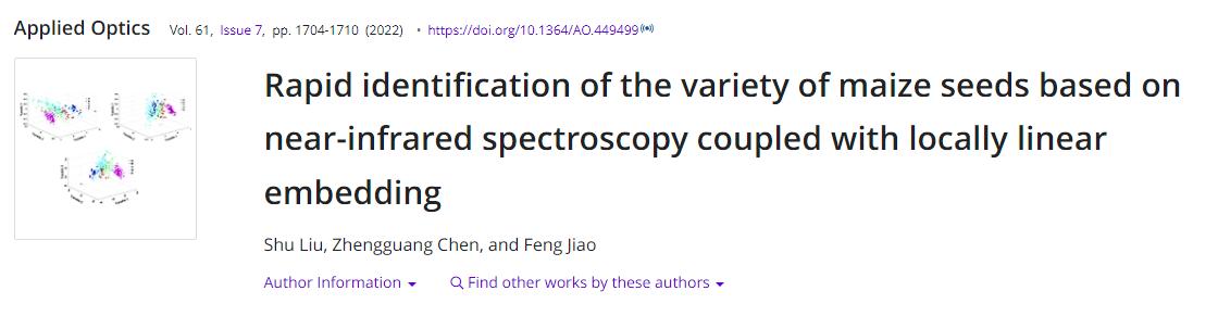 公司英国上市公司365陈争光教授指导的2020级硕士研究生刘姝以第一作者,陈争光教授为通讯作者在中科院分区三区期刊《AppliedOptics》在线发表了题为“Rapididentification of the variety of maize seeds based on near-infraredspectroscopy coupled with locally linear embedding”的研究论文(DOI:https://doi.org/10.1364/AO.449499)。