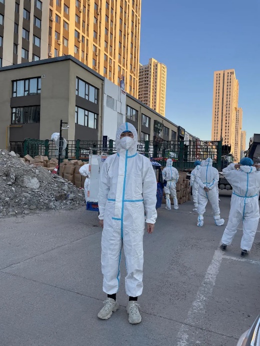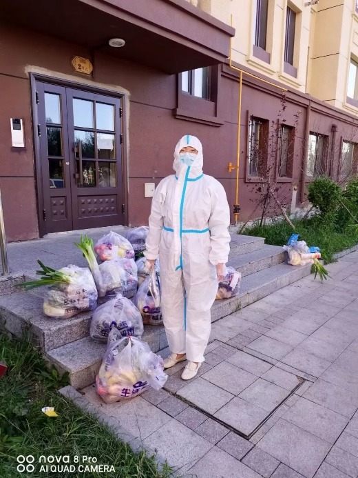 20级农业工程与信息技术研究生包昌浩担任志愿者期间在为小区居民搬蔬菜包