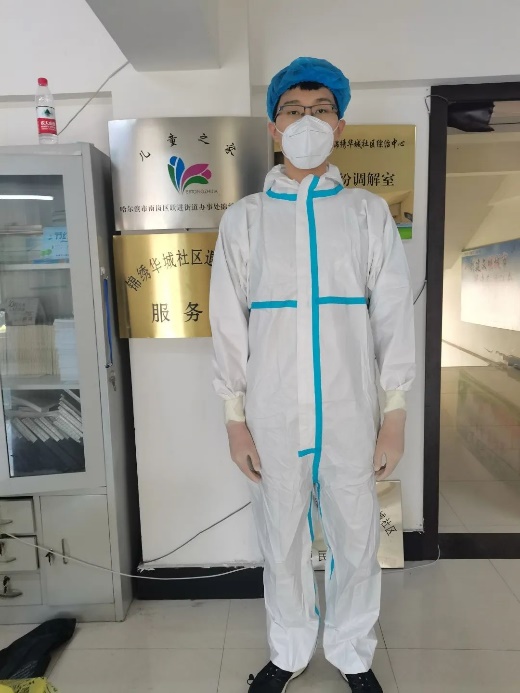 实验员党员于润众在担任疫情防控志愿者
