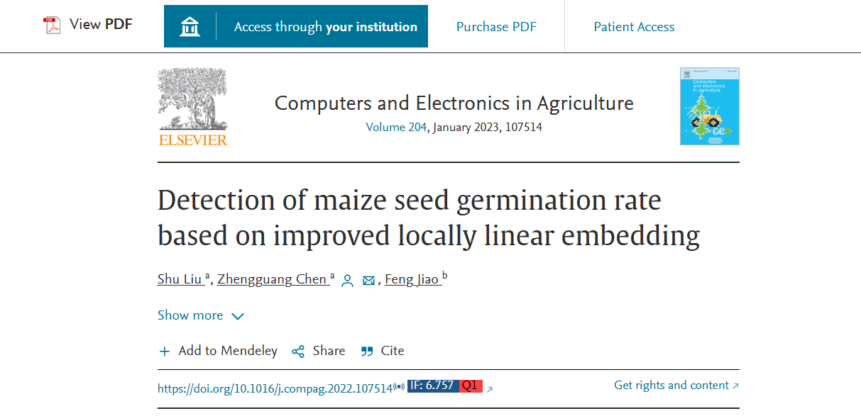公司英国上市公司365陈争光教授指导的2020级硕士研究生刘姝以第1作者,陈争光教授为通讯作者在中科院分区1区SCITOP( IF:6.757 )期刊《Computersand Electronics in Agriculture》发表了题为“Detectionof maize seed germination rate based on improved locally linearembedding”的研究论文。(https://doi.org/10.1016/j.compag.2022.107514IF:6.757 Q1 )