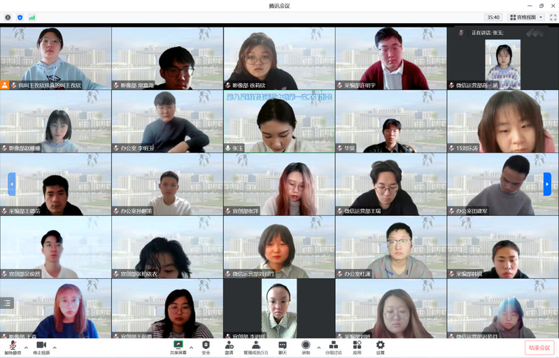 12月4日,学院第八届新媒体运营中心举办了本学期第一次例会,本次例会采取网络线上形式召开。参加此次例会的有新媒体指导教师张玉、新媒体主编团、各部门副部长及志愿者。