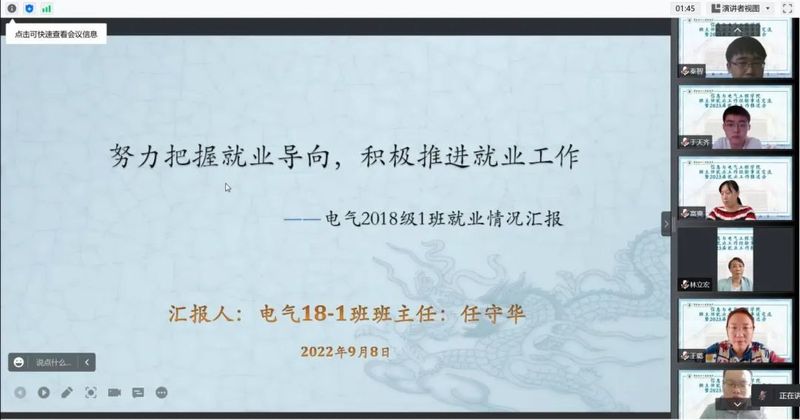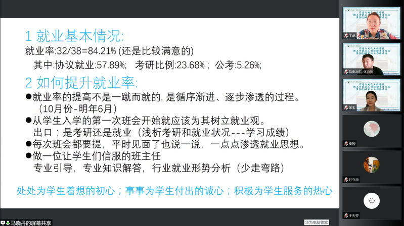 在会议上,班主任任守华做《努力把握就业导向,积极推进就业工作》汇报,从就业分布及就业种类等多方面总结并分享了目前的工作成果。并作出班级情况分析,从班级组成、学习风气、荣誉表彰等多方面详细探讨班级现状,指出推进就业工作的关键在于加强对毕业生就业意识地引导。