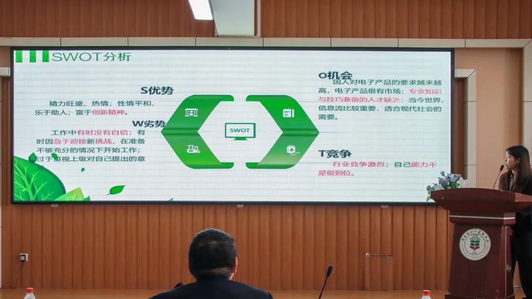 本次比赛根据参赛选手的个人材料和现场表现两个维度进行打分,9位选手依次上台简述自己对于职业生涯规划的理解,用ppt的形式对自己职业生涯规划进行说明与讲解。随后,评委结合选手的展示,从职业目标合理性、职业路径分析、评估方向等方面对选手进行了压力面试。