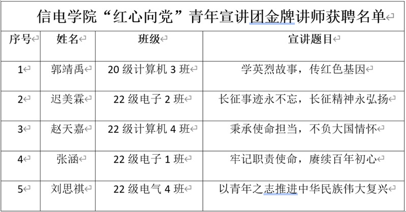 最终,本次试讲评级会评选出了五名金牌讲师作为学院“红心向党”青年宣讲团的核心力量,通过此次宣讲,加深了同学们对党的二十大精神的了解,同学们深刻认识到新时代肩上沉甸甸的责任。要坚定不移听党话、跟党走,怀抱梦想又脚踏实地,敢想敢为又善作善成,立志做有理想、敢担当、能吃苦、肯奋斗的新时代好青年,让青春在全面建设社会主义现代化国家的火热实践中绽放绚丽之花。