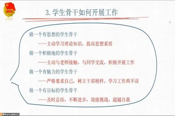 第三课的员工骨干培训由张玉老师带领全体员工骨干学习了“新时期员工骨干应具备的基本素质与工作方法”,培训中,告诉我们员工骨干要忠诚于信仰,自律于操守,扎根于青年,成才于组织,做社会主义事业的合格建设者和可靠接班人。