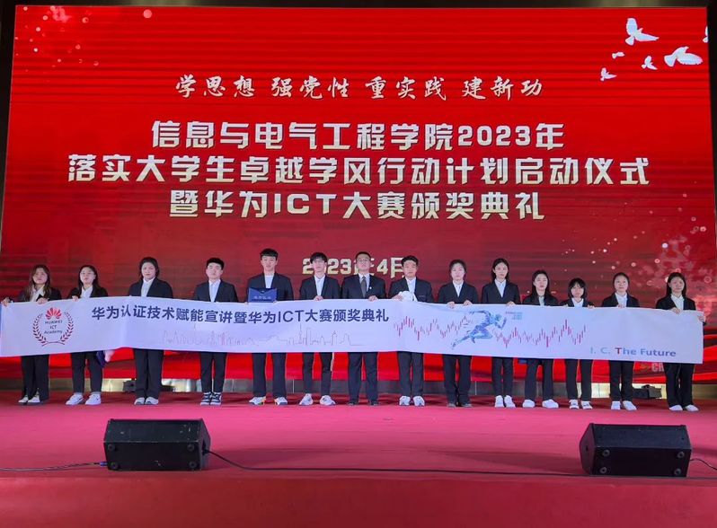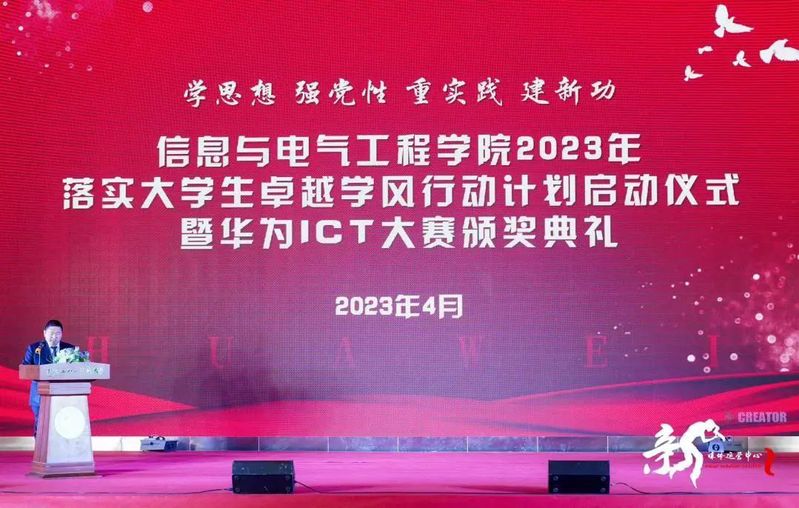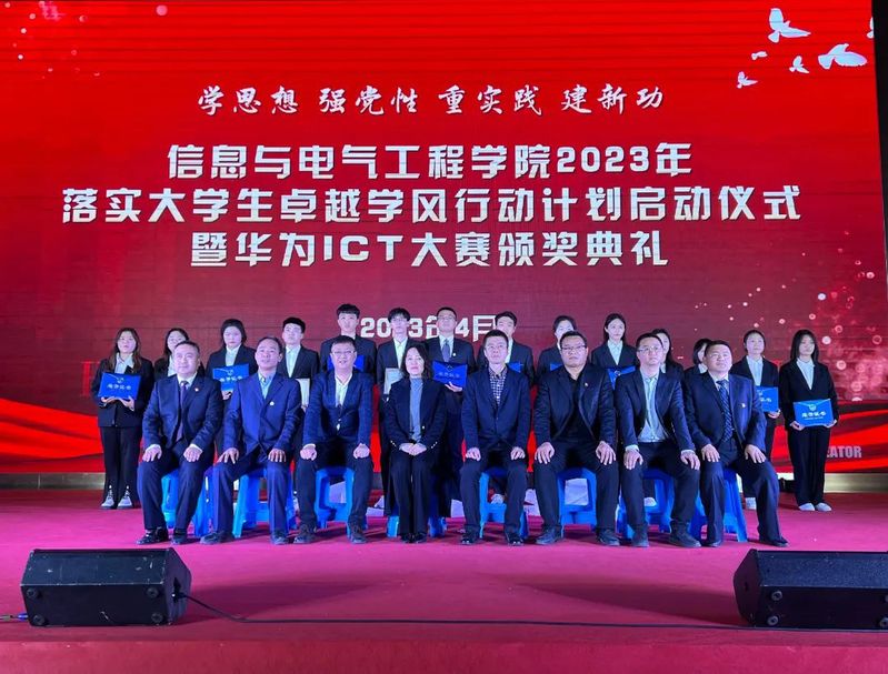 4月19日,信电学院举办2023年落实老员工卓越学风行动计划启动仪式暨华为ICT大赛颁奖典礼,典礼在体育馆举行。校团委书记李颖、员工处副处长赵铁丰、教务处副处长王宪青、学院领导班子全体成员、华为技术有限公司伙伴负责人郭坤庆、华为授权合作伙伴黑龙江省龙旭网络技术有限公司经理万具忠、学院各系部主任、获得华为认证教师代表及学院全体2020、2021、2022级员工参加本次会议。