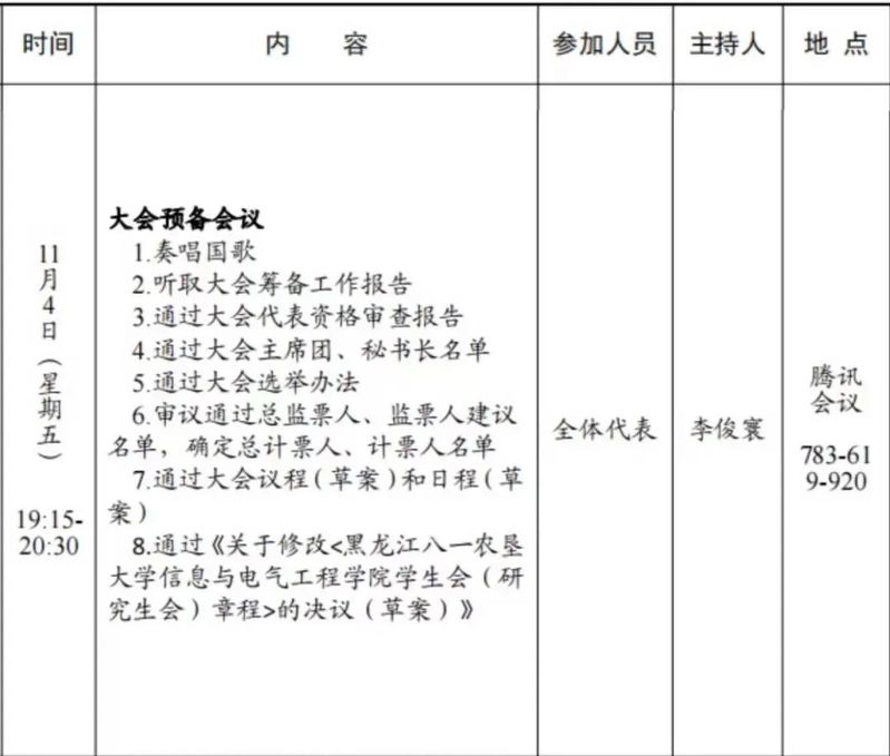 会议上,大会筹备工作委员会会务组组长、研究生会指导教师林立宏宣读了《大会筹备工作报告》;大会筹备工作委员会材料组组长于天齐宣读了《大会主席团、秘书长名单》《大会总监票人、监票人建议名单,总计票人、计票人建议名单》;大会秘书长、员工会指导教师张玉宣读了《关于修改<英国上市公司365信息与工程学院员工会(研究生会)章程>的决议》。