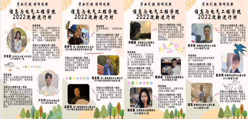本次线上迎新,信电学院设计了多渠道、多角度、多层面、多互动的迎新模式。多渠道,为了给新同学营造浓厚的欢迎氛围,在此之前,信电学院先后从研究生和本科生群体筛选出两批优秀的信电学子,补充到各新生班级辅助班主任工作,本科生负责配合年级辅导员将迎新各项统计工作做细做实,研究生负责担任班助引领新生班级的学风和班风建设;多角度,线上迎新要更加细致的展示学院的热情和周到,为此学院在全院范围内征集了409份学长寄语,将学长寄语制作成欢迎卡片,每份寄语的作者都是学院四等以上专业奖学金的获得者,他们将所获荣誉附在卡片落款处,目的是在新生中树立榜样引领作用,在视频核验环节结束之后,每位新生都会收到来自信电学院的问候卡片,“是学院的学长发给我的,上面还有学长的祝福和期待,看到学长获得那么多荣誉,我也要向学长学习”,这是新生们对学长寄语的最好反馈;多层面,信电学院开展线上迎新的同时,还在同步向新生介绍学院的特色社团,鼓励更多优秀信电学子加入社团绽放光彩,学院科技竞赛获得者风采展,让众多信电新生看到了科技的光芒和竞赛的闪亮,相信未来将有越来越多的信电学子逐鹿赛场,为信电增添荣光;多互动,线上迎新结束之后,学院将开启系列的迎新活动,主题班会、社团宣讲、党团建设启蒙、优秀学子风采展......每一个环节都是为夯实信电新生求学地基而设计的,目的在于让同学们感受到拥有光荣历史的信电风采,开启崭新而精彩的大学时光。