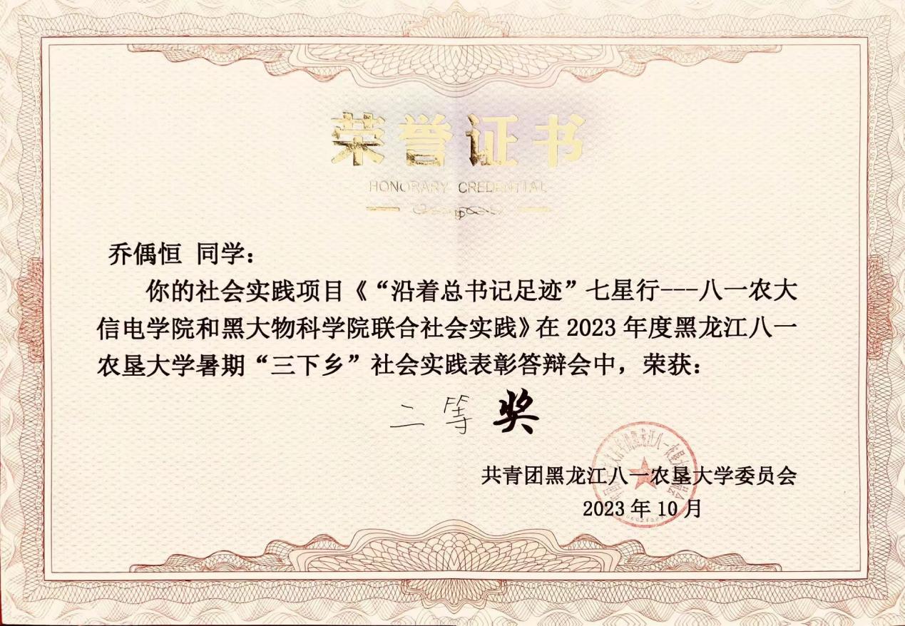 2023年暑假,信电学院积极组织员工投身“三下乡”社会实践活动,他们或是扎根农村进行支教,或是深入垦区开展研学活动,或是走进大街小巷开展红色宣讲......信电学子在祖国基层各战线上踏实实践,汲取向上力量。在2023年学校暑假“三下乡”社会实践表彰答辩会中“新青年三农服务队”实践团队荣获“社会实践优秀团队二等奖”、2022级计算机专业员工乔偊恒荣获“社会实践先进个人二等奖”。