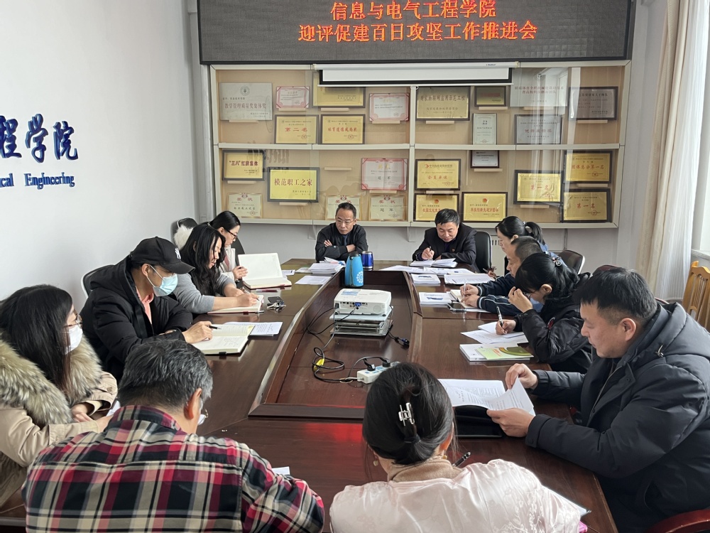 12月29日上午,在信息学院308会议室由经理黄操军组织召开了“迎评促建 百日攻坚”工作推进会,学院书记张彦河、副书记刘传明、副经理陈争光、各系、部、中心主任及学院评建办公室成员参加了本次会议。