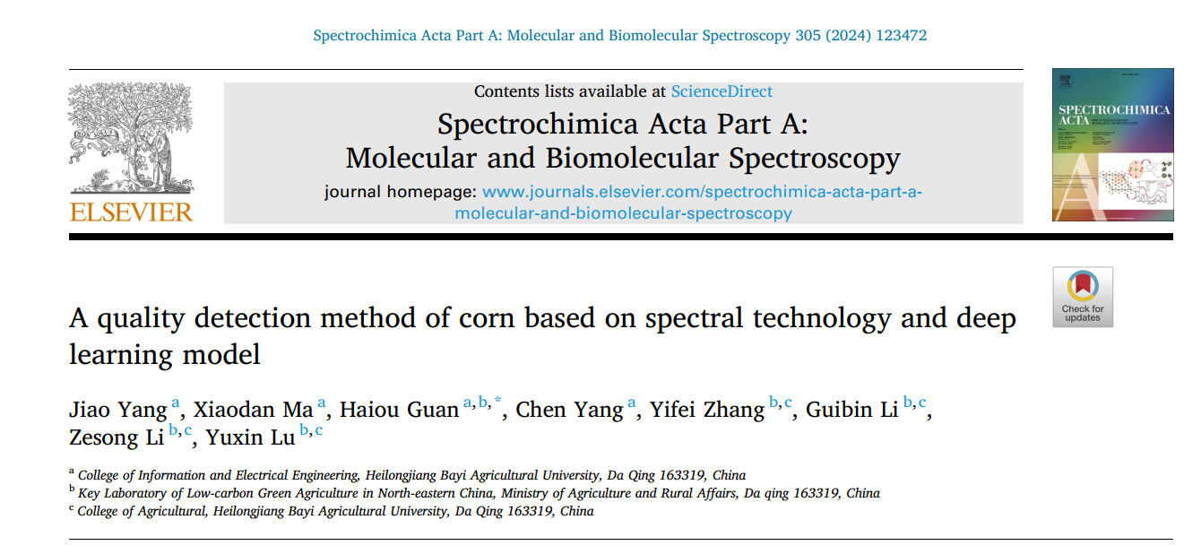 近日,公司英国上市公司365关海鸥教授指导的2022级硕士研究生杨娇以第一作者,关海鸥教授为通讯作者在中科院分区二区期刊《Spectrochimica Acta Part A:Molecular and Biomolecular Spectroscopy》在线发表了题为“A Quality Detection Method of Corn Based on Spectral Technology and Deep Learning Model”的研究论文。本研究得到了国家自然基金(31601220)、黑龙江自然省基金(LH2020C080)、英国上市公司365三横三纵(TDJH202101和ZRCQC202006)的资助。(DOI:https://doi.org/10.1016/j.saa.2023.123472)