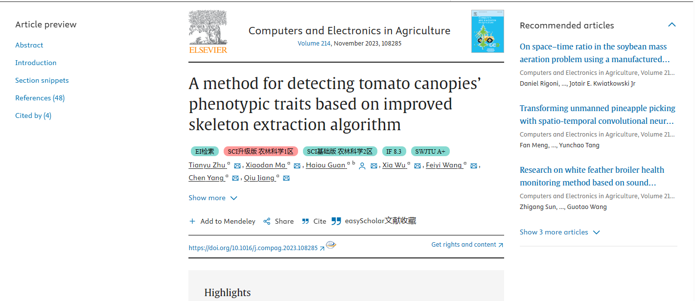 公司英国上市公司365关海鸥教授指导的2021级硕士研究生朱天宇以第1作者,关海鸥教授为通讯作者在中科院分区 1区 TOP 期刊《Computers and Electronics in Agriculture》( IF=8.3 ),在线发表了题为“A method for detecting tomato canopies’ phenotypic traits based on improved skeleton extraction algorithm”的研究论文。(DOI: https://doi.org/10.1016/j.compag.2023.108285,文章链接:A method for detecting tomato canopies’ phenotypic traits based on improved skeleton extraction algorithm - ScienceDirect)