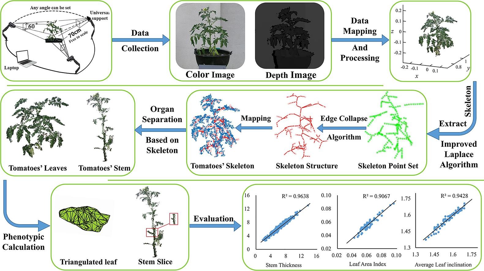 番茄冠层三维表型性状自动获取对于番茄品种选育和科学栽培具有重要意义。番茄是无限生长特性作物,植株器官生长随机强且结构复杂,导致冠层器官水平的表型参数难以获取。因此,本研究提出一种基于改进骨架提取算法的番茄冠层表型参数计算方法。首先,在多视角采集番茄冠层点云数据的基础上,精准重建了番茄冠层点云的三维模型。其次,提出了利用最小二乘法简化拉普拉斯(Laplace)骨架提取算法的空间收缩权重计算方法,从而获取番茄冠层的骨架点集,并应用贪婪算法优化边缘折叠算法,提取了精准可靠的冠层骨架结构。然后,结合作物的冠层生长特性和内部特征描述(ISS)原理对精简的骨架结构进行局部主成分分析,实现了番茄主茎和叶片器官点云的分离。最后,应用基于德洛内(Delaunay)三角剖分的建模算法,重构了分离后的器官模型,并计算了茎粗、叶面积指数和平均叶倾角等参数,并与不同生长时期的表型实测值对比进行性能评价。实验表明,改进骨架提取算法的平均精确度、平均召回率、平均准确率和微分F1分数分别为0.9144、0.7751、0.7243和0.8306。番茄冠层的茎粗、叶面积指数和平均叶倾角的计算值与测量值之间的整体决定系数R2依次为0.9638、0.9067和0.9428,均方根误差RMSE依次为0.3922、0.0029和0.0186。本研究提出的改进骨架提取方法能从结构复杂的番茄冠层中提取简洁的骨架拓扑结构,并快速准确地计算了其表型参数,为研究番茄“基因型-表现型-环境型”之间相互作用提供了坚实的技术支撑。
