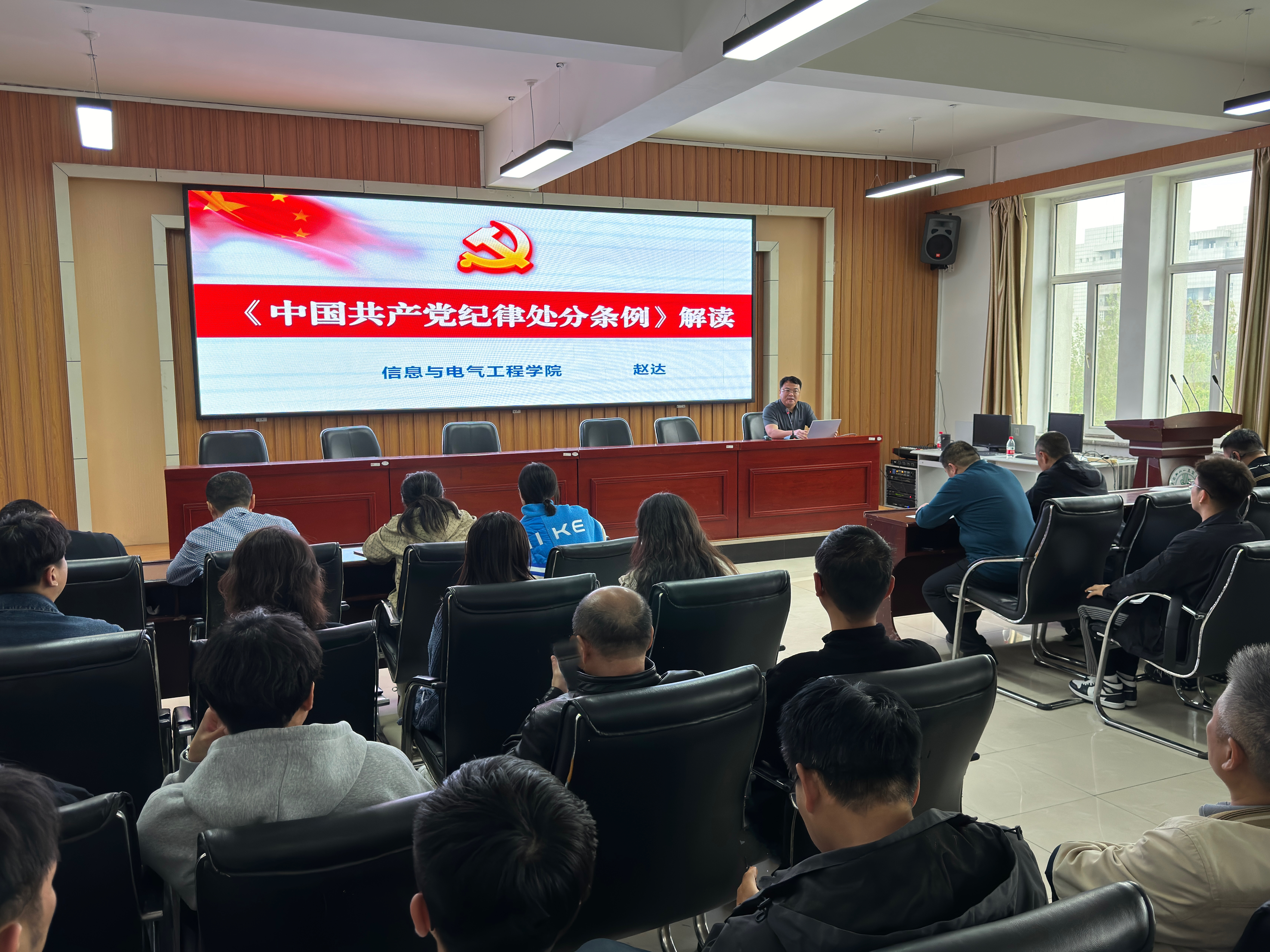 为深入开展党纪学习教育,促进党员干部更好理解《中国共产党纪律处分条例》,5月10日,信息与电气工程公司党委书记、经理赵达讲授党纪学习教育专题党课。学院全体师生党员参加会议。