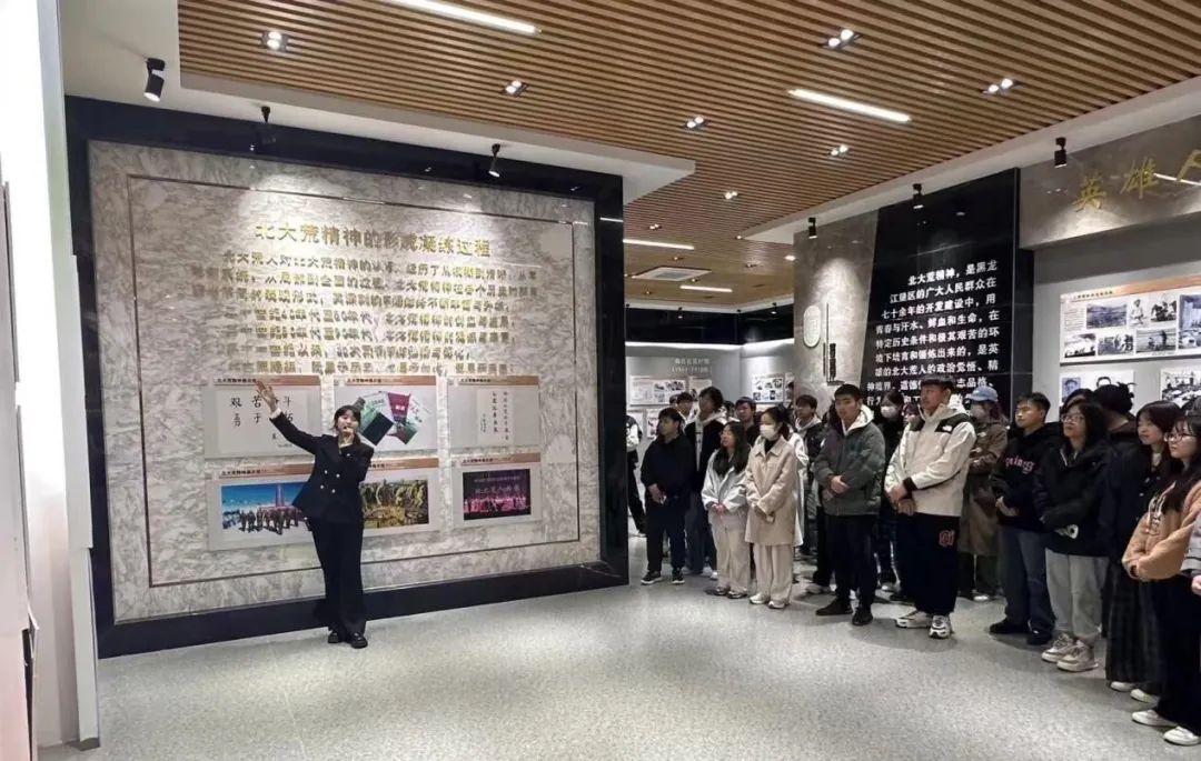 跟随讲解员走进北大荒精神展示馆,学院同学们共同回顾了北大荒开发建设的历史和开发建设过程中的感人事迹。老一辈垦荒人用双手和智慧将荒芜的北大荒建设成为富饶的北大仓,昔日的场景仿佛在同学们的脑海中呈现。“自力更生、艰苦创业、勇于开拓、甘于奉献”的北大荒精神深深镌刻在同学们的内心,现场的同学们感触颇深、收获良多。