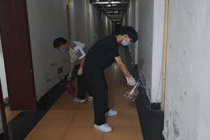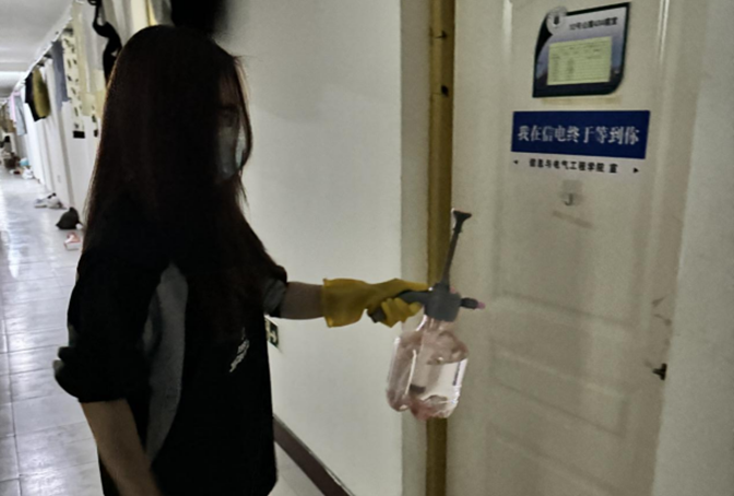 在消杀工作中,志愿者们手持消毒设备,对员工公寓进行了全方位的消毒处理。从走廊到寝室,从地面到墙面,从门窗把手到公共区域,每一个细节都不放过,确保消毒工作无死角、全覆盖。志愿者们秉持着高度的责任心和严谨的工作态度,严格按照消毒流程进行操作,确保每一步都达到最佳的消毒效果。志愿者们的辛勤付出,不仅为员工们提供了一个更加干净、整洁、安全的居住环境,也彰显了学院对员工身心健康的深切关怀。