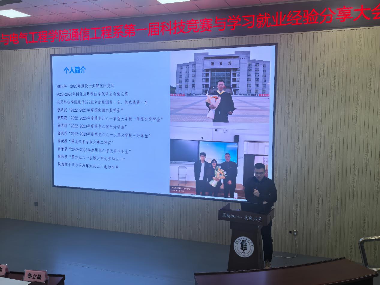 通信协会会长夏安超分享科技竞赛心得。大庆沃尔沃分公司19级优秀毕业生郑帅分享大厂就业经验,详述求职细节和技巧,为学弟学妹提供宝贵建议,反响热烈。三加一企业华育兴业技术总监白宇剖析就业形势,助力同学们规划职业生涯、明确目标,引发极大兴趣。