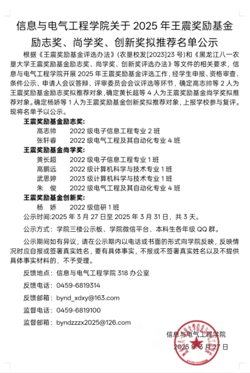 公司2025年王震奖励基金励志奖、尚学奖、创新奖拟推荐名单公示