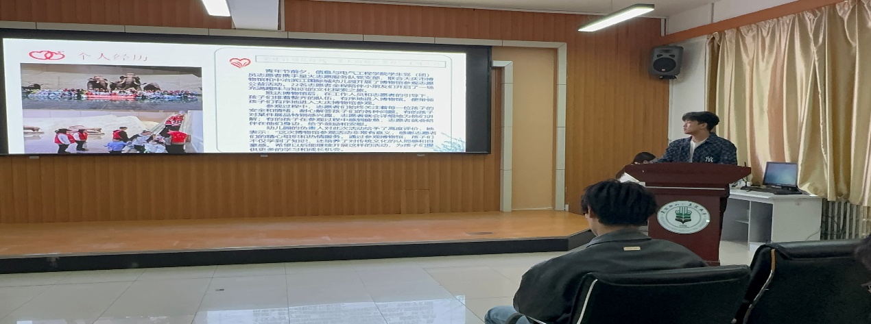 活动中,四位优秀青年结合自身经历,从不同角度展现了新时代青年的责任与风采。校“优秀共青团干部”荣誉称号获得者邵会轩以创新党团共建形式为切入点,讲述如何用行动践行“责任在肩”的使命担当;校“优秀志愿者”代表伦世杰分享志愿服务故事,诠释“奉献无悔”的青春温度,彰显“以爱心温暖社会”的信念;校“优秀员工骨干”代表张恒鸣立足学业与工作的平衡,展现“务实笃行”的初心,在服务同学中实现自我成长;校“优秀共青团员”卢玮东作为退伍军人,以“退役不褪色”的作风投身科研与志愿服务,用军人本色书写青春篇章。
