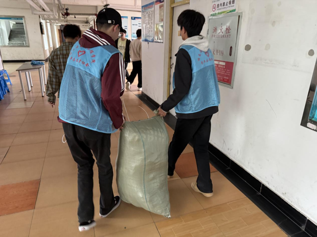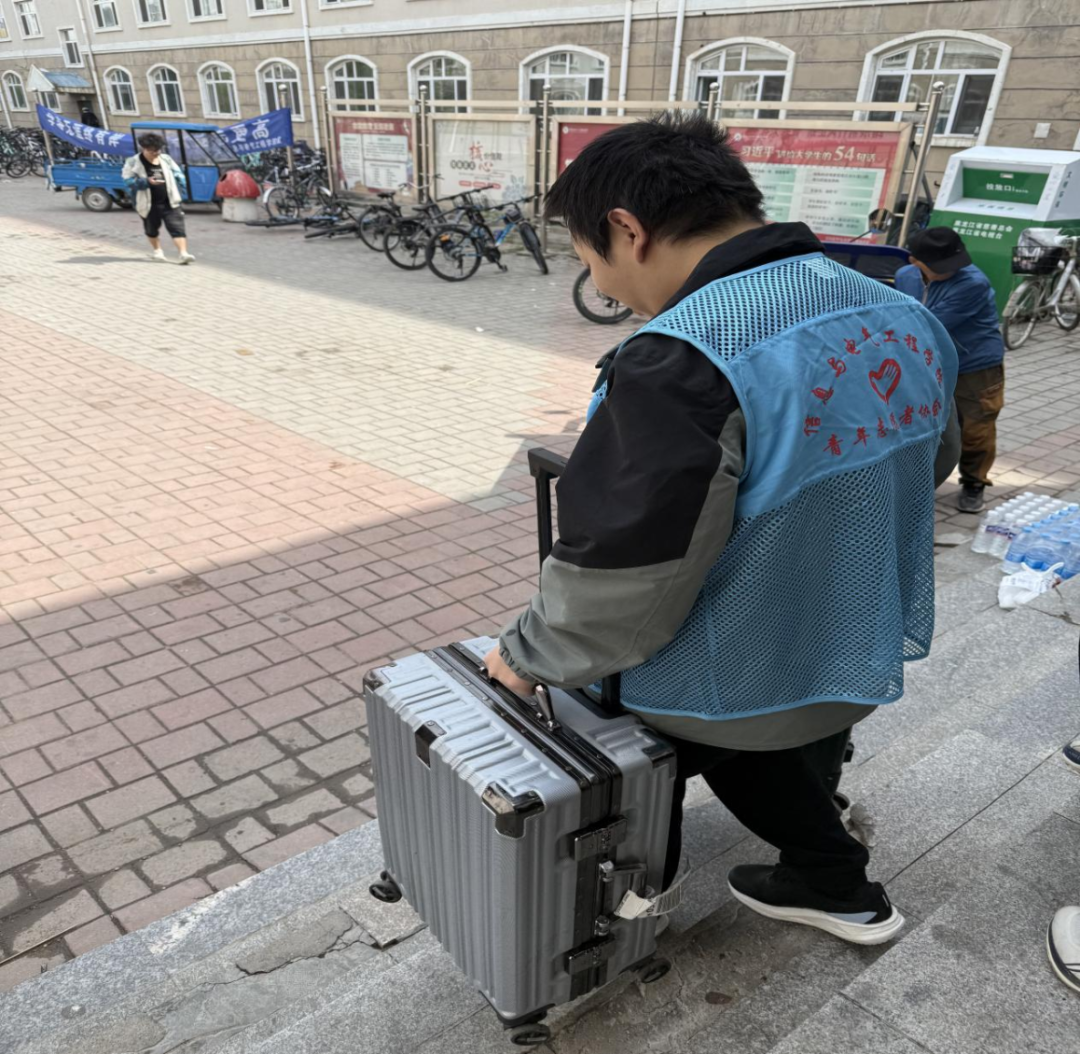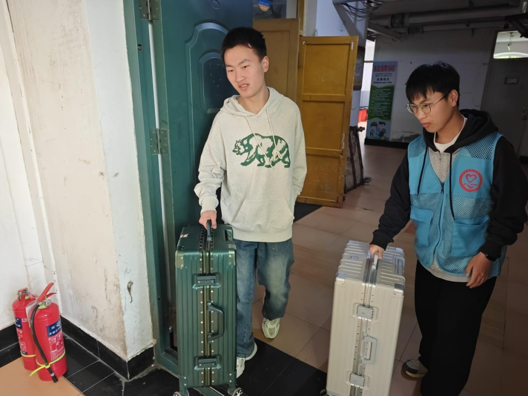 在宿舍楼道内,志愿者们两人一组,合力搬运着沉重的包裹。有的志愿者一手拉着一个行李箱,在长长的楼道里往返奔波;有的志愿者则细心地帮学长学姐整理物品,确保行李安全有序搬运。