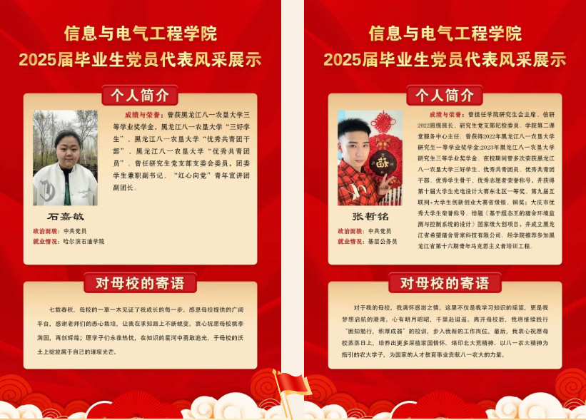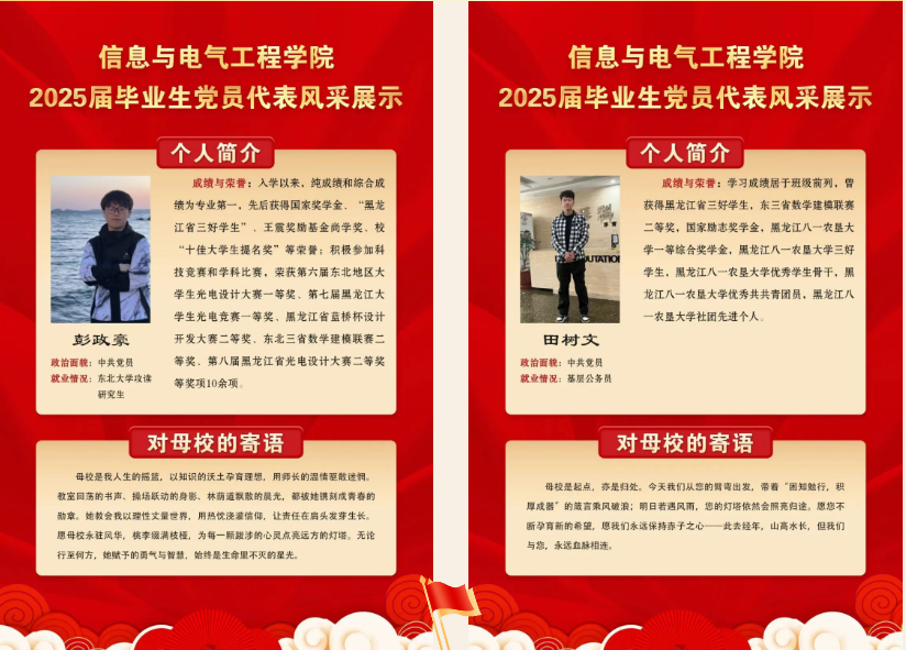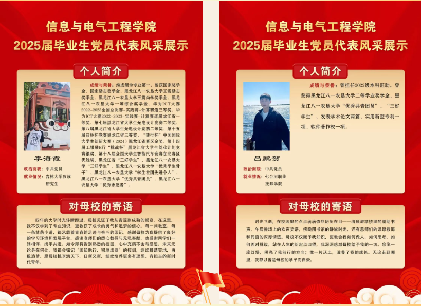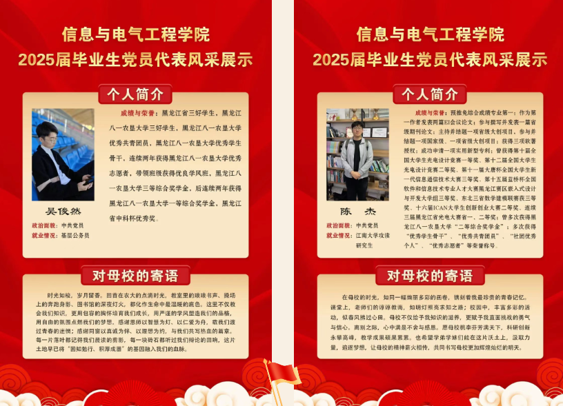 公司为2025届毕业生党员精心制作了展示板,全面展示了他们在校期间所取得的卓越成绩和先进事迹。学院希望通过此次展示活动,激励广大在校学子不断追求进步,努力提升自身素质。同时,也期待通过这种宣传方式,让更多人了解毕业生党员的先进事迹,进一步弘扬党的优良传统和作风,推动校园文化建设。